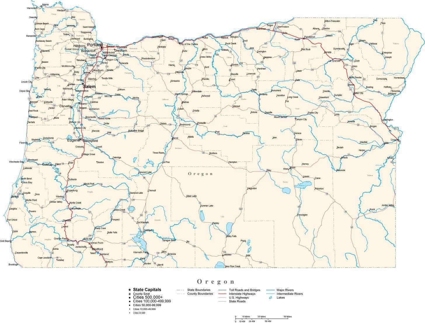 Oregon Digital Vector Map with Counties, Major Cities, Roads